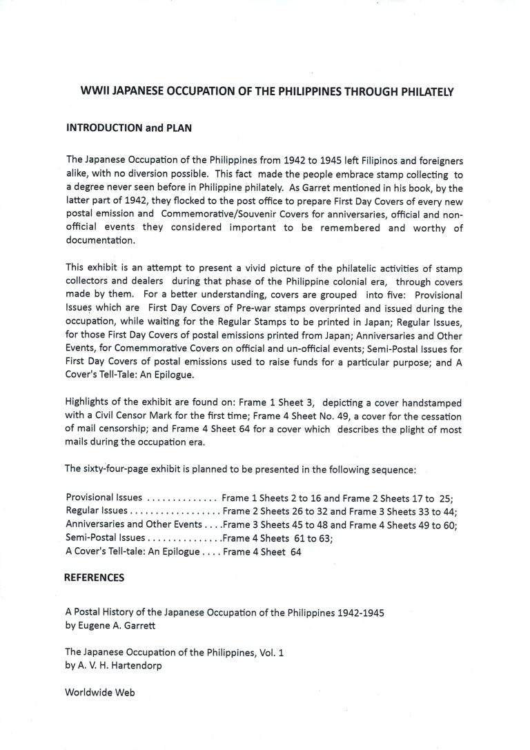 EXHIBIT NUMBER 85 Exhibit Name: WWII JAPANESE OCCUPATION OF THE PHILIPPINES THROUGH PHILATELY Exhibitor's name: LUNESITA BREUER Frame#1 (Page 1-16) Frame#1 Frame#2 Frame#3 Frame#4